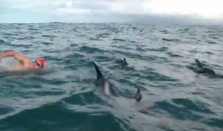 Участник плавательного марафона “Ocean's Seven” надолго запомнит 8-часовой заплыв - во время того, как он пересекал залив Кука, им заинтересовалась акула. К счастью, на помощь пловцу пришла стая