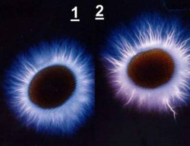 1 - аура в состоянии гармонии; 2- аура в состоянии стрессаНам уже доводилось сообщать об уникальных исследованиях Софии Бланк, которая возглавляет Научно-исследовательский центр фирмы "Бион" в США